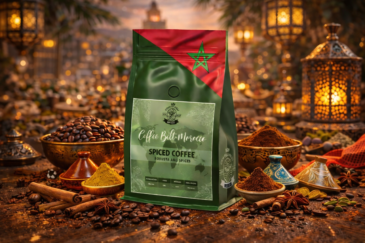 Un café marocain épicé élaboré à partir d’un Robusta puissant et généreux, sublimé par un mélange d’épices traditionnelles marocaines telles que le gingembre et la cannelle.